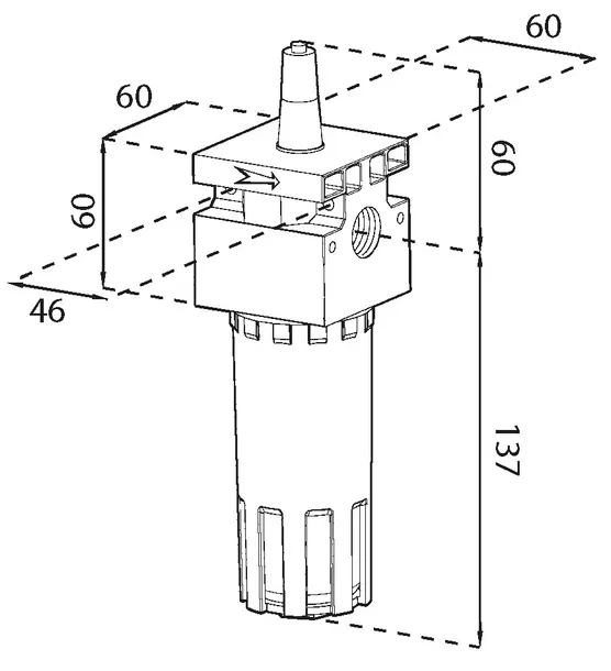 - Blok naolejacza wyposażony w dwa gwinty wewnętrzne, umożliwiające montaż w obu kierunkach zgodnie z przepływem powietrza (oznaczonego strzałką na bloku).