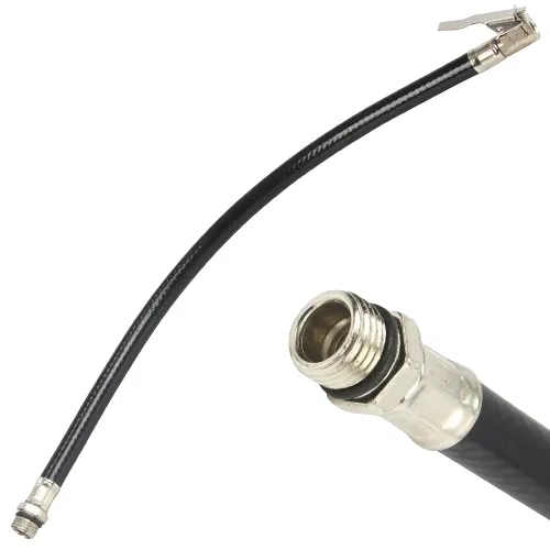 Przewód do pistoletu do pompowania o długości 35 cm, wykonany z trwałych materiałów, zapewniający szczelność i niezawodność. Oba końce przewodu są maszynowo zaciśnięte, co eliminuje ryzyko wycieków powietrza. Końcówka montażowa wyposażona jest w popularny gwint zewnętrzny 1/4" wraz z gumową uszczelką, gwarantującą szczelne połączenie. Końcówka do pompowania wykonana jest z mosiądzu i jest rozkręcalna, co pozwala na łatwą wymianę wewnętrznej gumowej uszczelki – szczególnie przydatne po długim okresie użytkowania, gdy uszczelka może się utlenić.